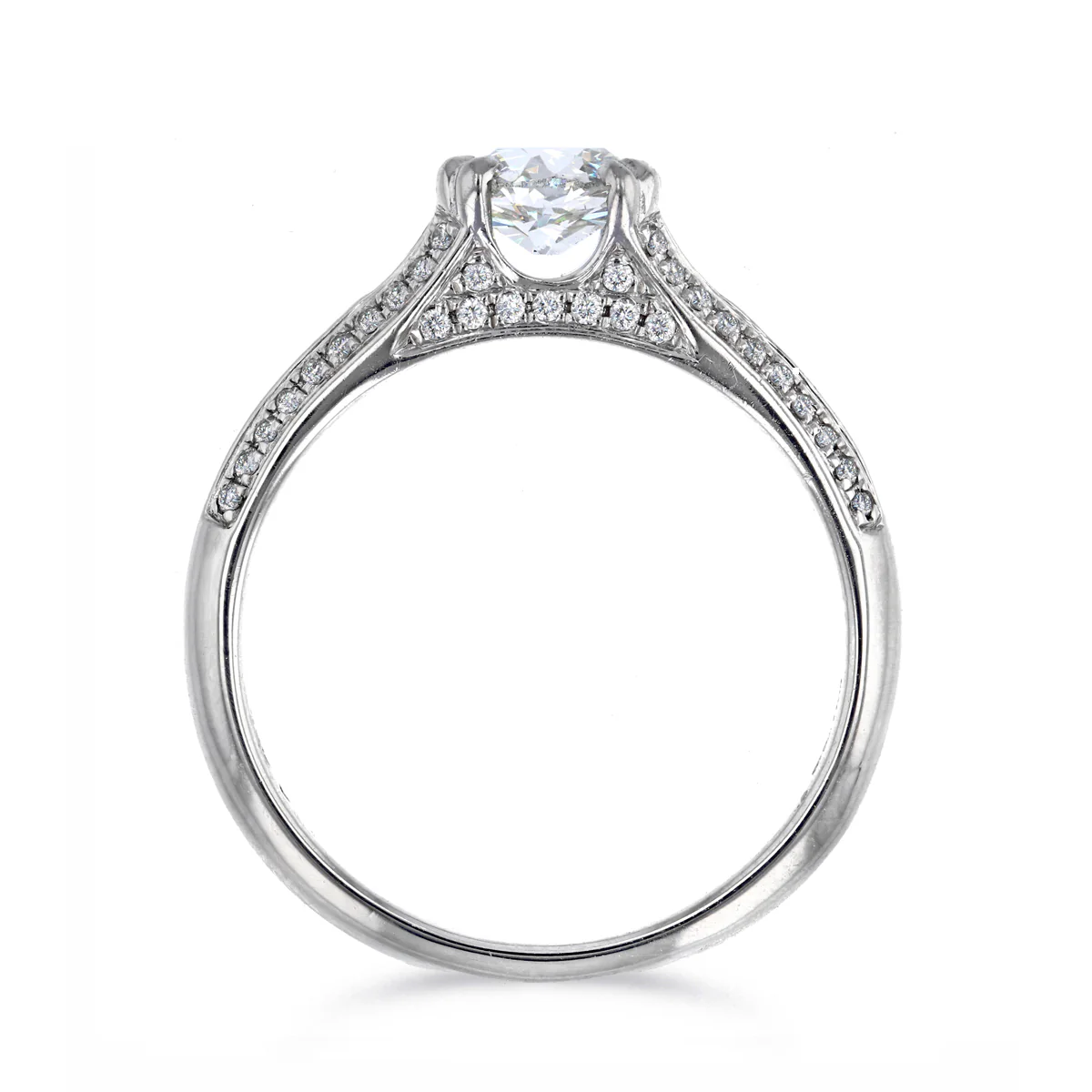 The split shoulder band, adorned with glistening diamonds, offers a contemporary touch that perfectly complements the vintage aesthetic.