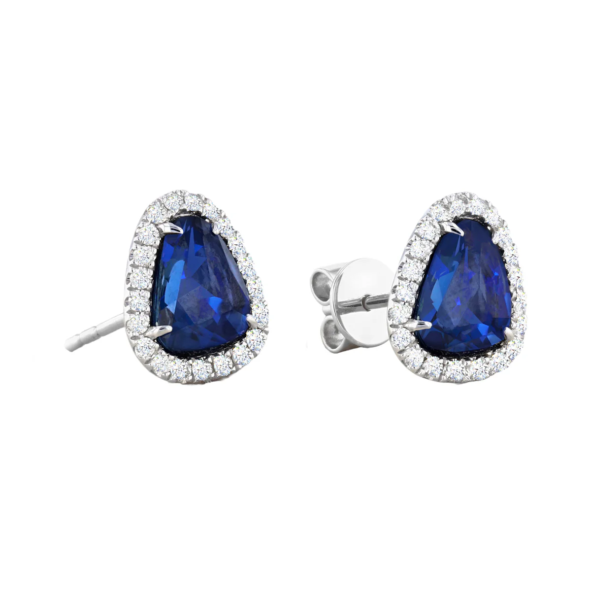 These gorgeous earrings have been crafted from 18K white gold and feature 2.34cts of rose cut deep blue sapphires surrounded by a halo of bright sparkling diamonds totalling 0.27cts adding that extra special touch to this beautiful piece.