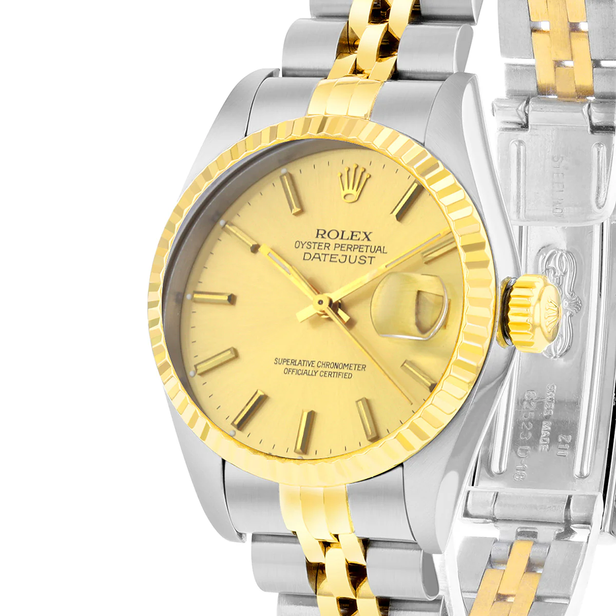 This Rolex Datejust 36 is crafted in yellow Rolesor (a combination of Oystersteel and 18ct yellow gold) and features a Fluted bezel with a Champagne dial, with applied index and a Cyclops lens date display at 3 o’clock. The watch is fitted to a Jubilee bracelet with a folding Oysterclasp.