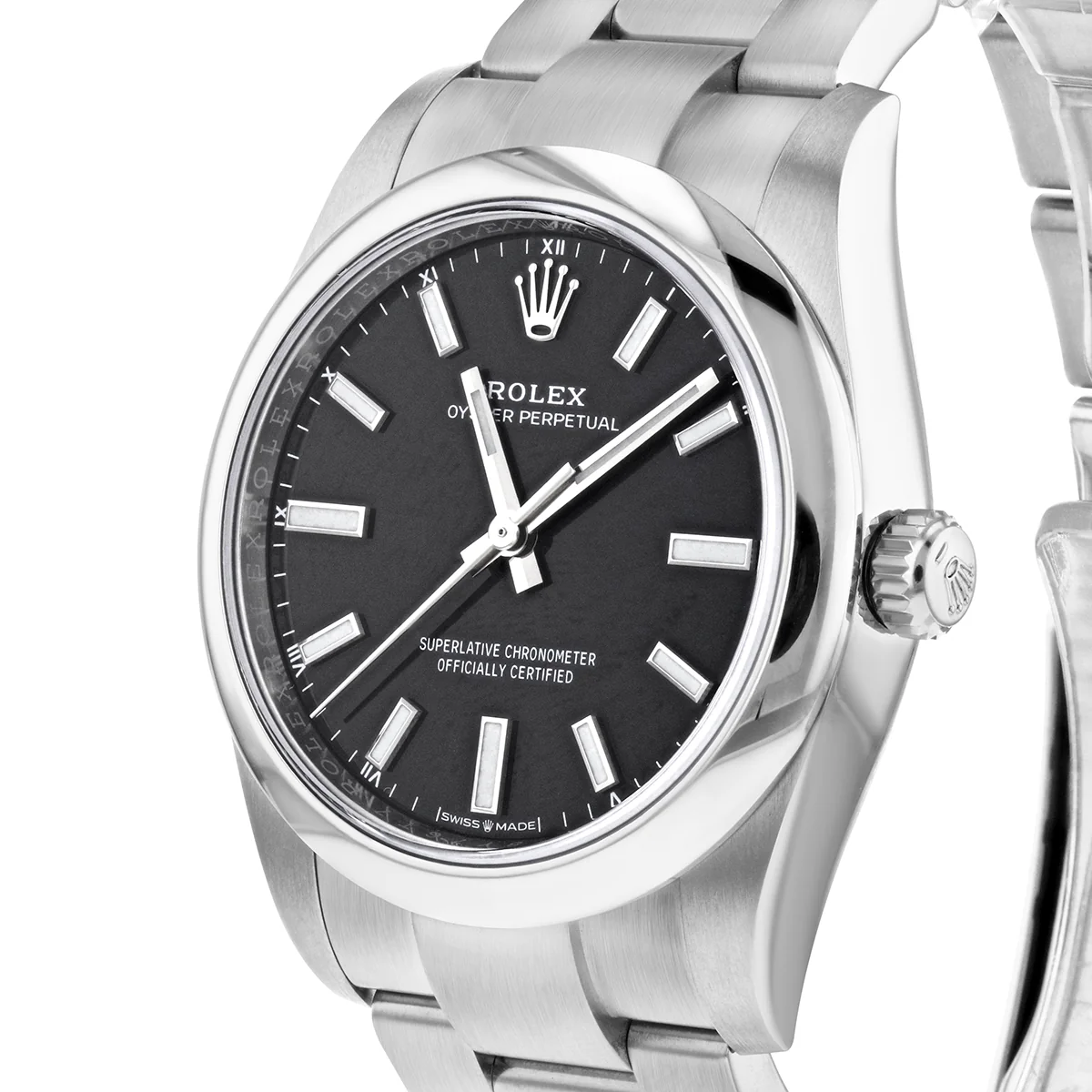 This Rolex Oyster Perpetual 34 is crafted in Oystersteel and features a black dial with Chromalight index and a domed bezel. This watch is fitted to an Oyster bracelet with folding Oysterclasp.
