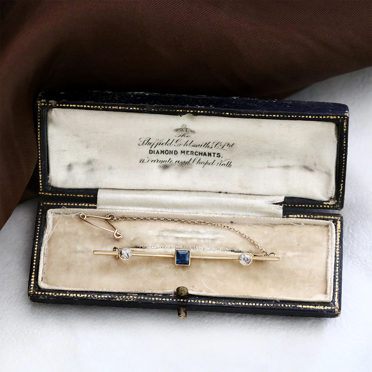 This vintage sapphire and diamond brooch is a timeless piece that exudes understated elegance. Crafted from yellow gold with perfect precision. The brooch showcases a sapphire gemstone in a classic princess cut. The feature stone is set within a plain frame. The bar brooch is further accented with old cut dimaonds to either side of the feature sapphire. The gemstone's soft, blue hue is set against a backdrop of warm, aged gold metal. The brooch's design is clean and minimalist, allowing the beauty of the aquamarine to take center stage. This accessory is a tasteful addition to any ensemble, offering a touch of vintage charm to any jewellery collection.